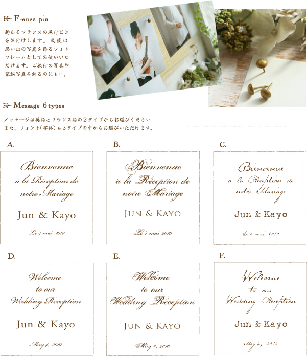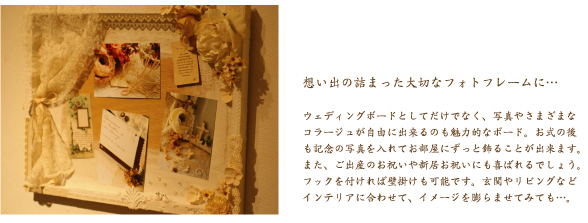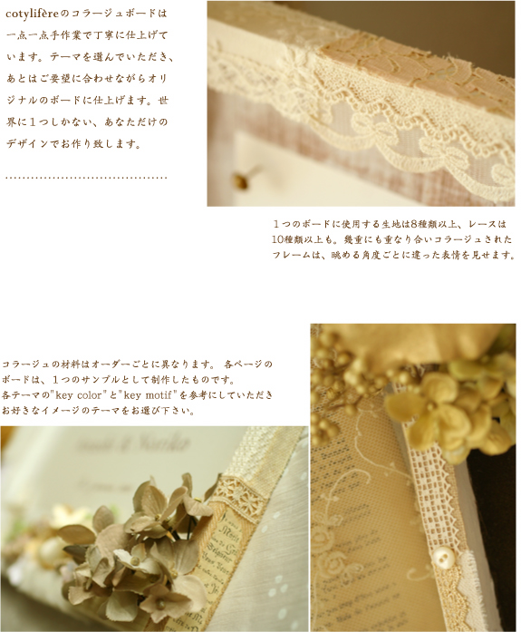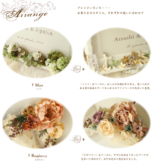 Q. コラージュの材料はどのくらい変わるのですか? A. 生地・レースの配置や、造花の組み合わせはその時々によって変わりますが、色合いや全体のイメージは変わりません。 基本的に、各テーマのkey motifは全てコラージュに取り入れて制作いたします。 Q. どんなリクエストが出来ますか? A. 例えば…「Mintで、小鳩のオブジェを加えてほしい」「Vanillaで、十字架チャームを加えてほしい」 →材料代追加(or調整)で変更出来ます。 「クローバーのモチーフをどこかに入れてほしい」→材料をお探しして、見つかればデザインに加えることが出来ます。 「Mintで、白系のお花を多めにしてほしい」→材料代追加(or調整)で変更出来ます。 Q. ウェルカムボードを立てるためのイーゼルは当日必要ですか? A. ボード単独では立ちませんので、会場ではイーゼルや椅子などに立てかけて置いてください。 Q. 打ち合わせはパソコンのメールでのやりとりのみですか? A. 材料が確定した時点で、一度イメージショットの画像をお送りしたりすることがありますので、パソコンでのやりとりが スムーズかと思われます。ご希望であれば携帯メールやお電話でもかまいません。